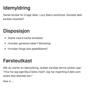 - Ide: En enkel arbeidstittel og noen stikkord om hva jeg kan skrive om.