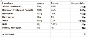 Men det siste problemet, som er hovedgrunnen til at jeg har laget Bakdel, er skalering. Når jeg baker brød vil jeg bake tre brød om gangen, siden det er det jeg har plass til i ovnen. Oppskriftene jeg finner er ofte for ett eller to brød om gangen, og da må jeg skalere selv. Så når jeg lagde meg et eget Excel-ark bare for å bake, da tenkte jeg at det må være mulig å gjøre dette bedre..
