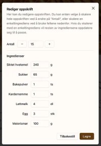 Etter omtrent en måneds arbeid har jeg et produkt jeg er relativt fornøyd med, og som jeg bruker flere ganger i uka når jeg skal bake. Ingrediensene vises inne i teksten selv om oppskriften er skalert, og man kan skalere oppskriftene basert på enkeltingredienser. I tillegg er det lite unødvendig informasjon, og ingen reklame. 🎉