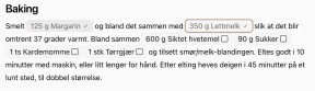 Med litt mer logikk kunne jeg også skalere ingrediensene underveis, slik at ferdig skalerte ingredienser kunne vises inne i teksten. Når jeg viste en liten demo frem til noen kolleager fikk jeg også tips om at det kunne vært fint å sjekke av ingrediensene underveis, og det gikk også ganske raskt å legge til. Med det var grunnproduktet på plass, og mesteparten av tiden etter det har gått med til finpuss.