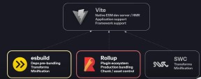 Vite er en bundler, som igjen er bygd oppå tre komponenter: esbuild, rollup og SWC: