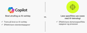 Når vi jobber med virksomheter som lykkes med AI, går den overordnede tilnæmringen igjen: de kombinerer bred utrulling av AI-verktøy med målrettede initiativer for å effektivisere konkrete oppgaver og prosesser. Det første handler om å gi ansatte bedre verktøy i hverdagen - eksempelvis Copilot integrert i arbeidsflyten. Dette gir raske, synlige gevinster og modne brukere. Det andre handler om å ta ut verdi på tvers av forretningsområder ved å løse spesifikke problemer: automatisere en tidkrevende rapportprosess, redusere feil i prognoser eller gjøre kunnskap mer tilgjengelig. Verdien ligger i kombinasjonen.