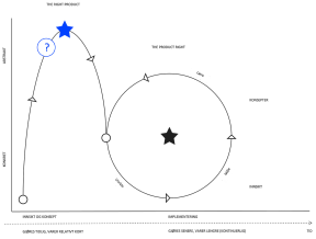 En innsiktsfase (som jeg stadig vekk prøver å kutte i, for å raskest mulig komme inn i iterasjonshjulet hvor jeg lærer på faktisk adferd og resultat), som skal gi en definisjon på en problemstilling. En kreativ idegenering hvor vi utforsker mulighetsrommet for hvilke retninger vi kan gå i, som kulminerer i et målbilde. Og så en enda kortere definering av kjernen av det målbildet, og hva som minimum må bygges for å understøtte det målbildet, sånn at vi kommer i gang med den faktiske læringen og resultatoppnåelsen gjennom kontinuerlige leveranser.