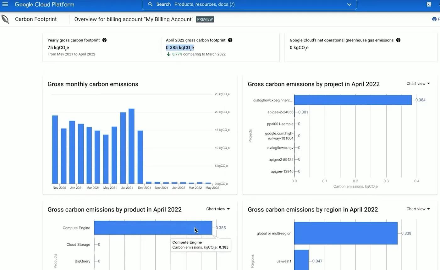 Google er nok den av de tre leverandørene som i størst grad har klart å lage en løsning for oversikt over utslipp som er lett å ta i bruk. Tjenesten kalles Carbon Footprint, og aktiveres med et klikk i konsollen. Her får du tilgang til totale utslipp, og nedbrytning på prosjekter, lokasjoner og produkter. Utslippet brytes også ned i scope 1, 2 og 3.