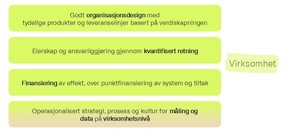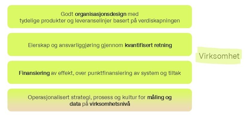 Et godt virksomhetsnivå har et organisasjonsdesign basert på verdiskaping — der produkter og leveranselinjer er definert etter kunde- og verdistrømmer, ikke etter interne strukturer. Retning uttrykkes gjennom kvantifiserte mål og effekter, ikke tiltak eller leveranser. Og tilsvarende, finansieringen følger effekt, ikke enkelttiltak. Strategien er mer enn et målbilde — den er operasjonalisert med ansvarliggjøring for verdiskapning prosesser og kultur for måling og oppfølging.