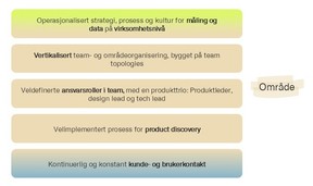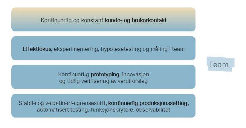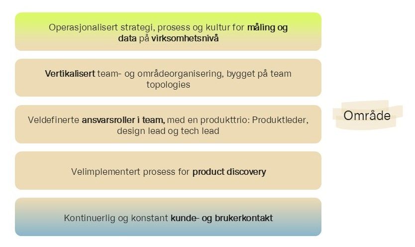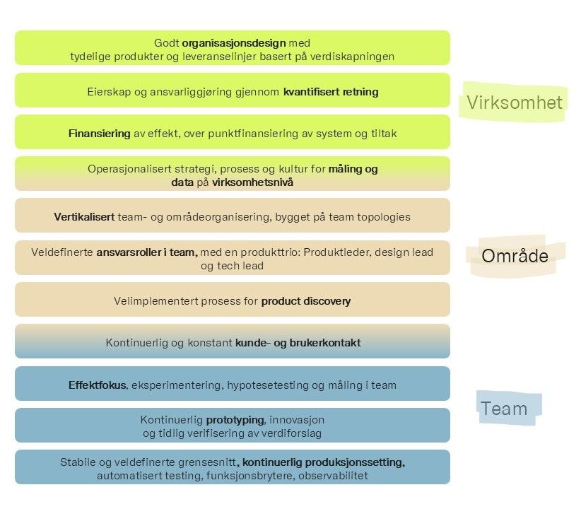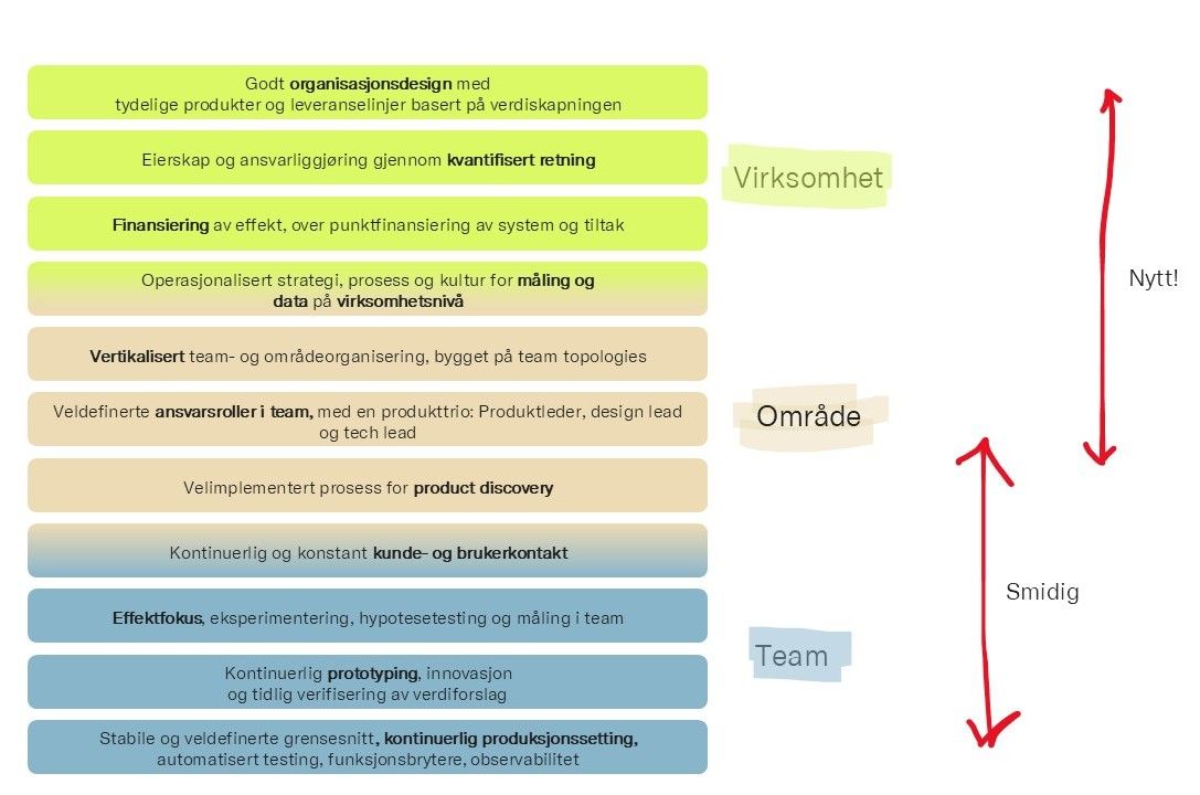Dette er ikke tilfeldige tekniske grep. Det er grunnmuren for å kunne jobbe produktorientert. Uten denne kapasiteten til å eksperimentere og justere, får ingen av de andre nivåene reell verdi å styre etter.