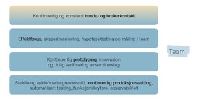 Når vi ser modellen samlet, blir det tydelig at produktorientering ikke starter med organisering. Den starter med selve arbeidet i team. Produktorientering er en forlengelse av smidig — ikke et alternativ, ikke et nivå over, men en videreføring. De grunnleggende ferdighetene i smidig arbeid er forutsetningen for å kunne jobbe hypotesedrevet og effektfokusert.