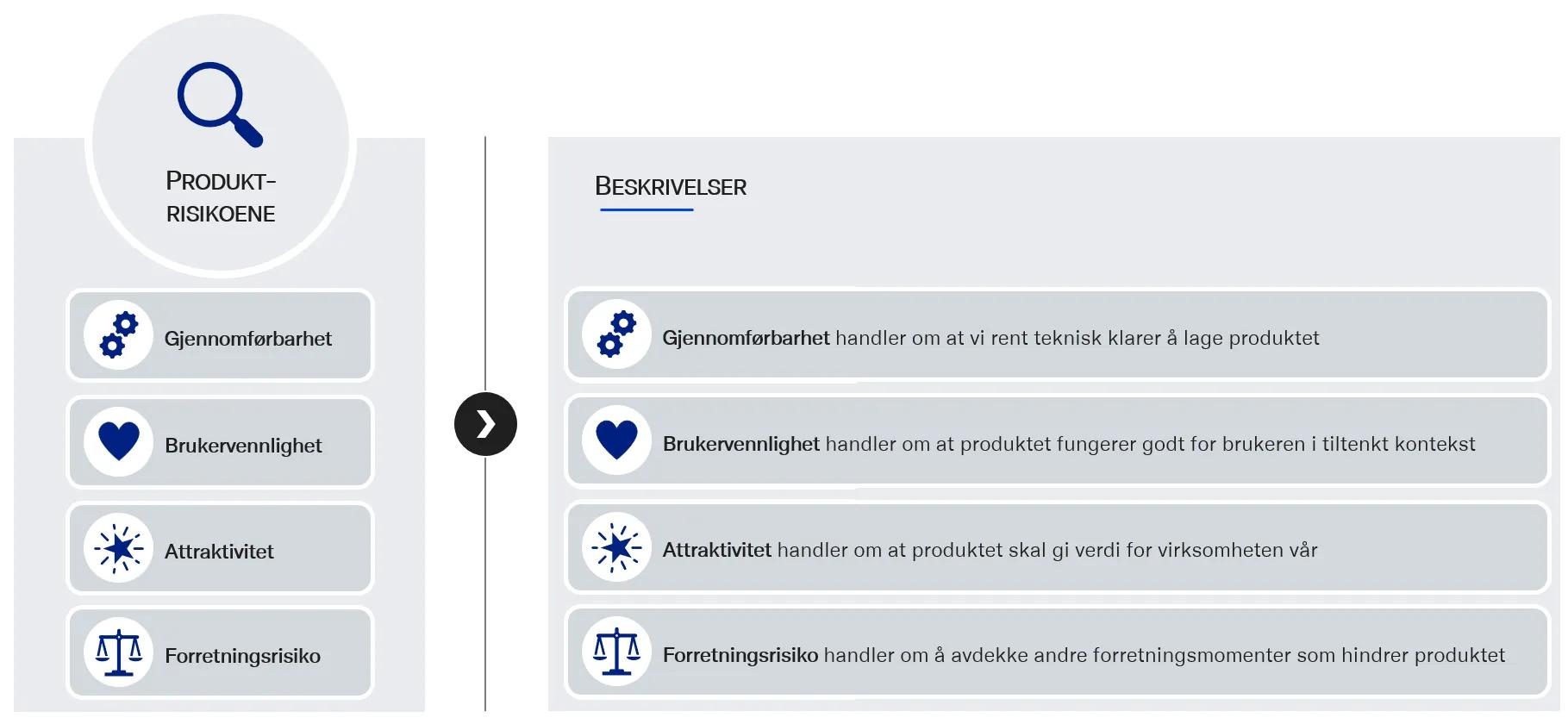 - Evaluere mulighetene. Dette gjøres gjerne ved hjelp av de fire produktrisikoene: