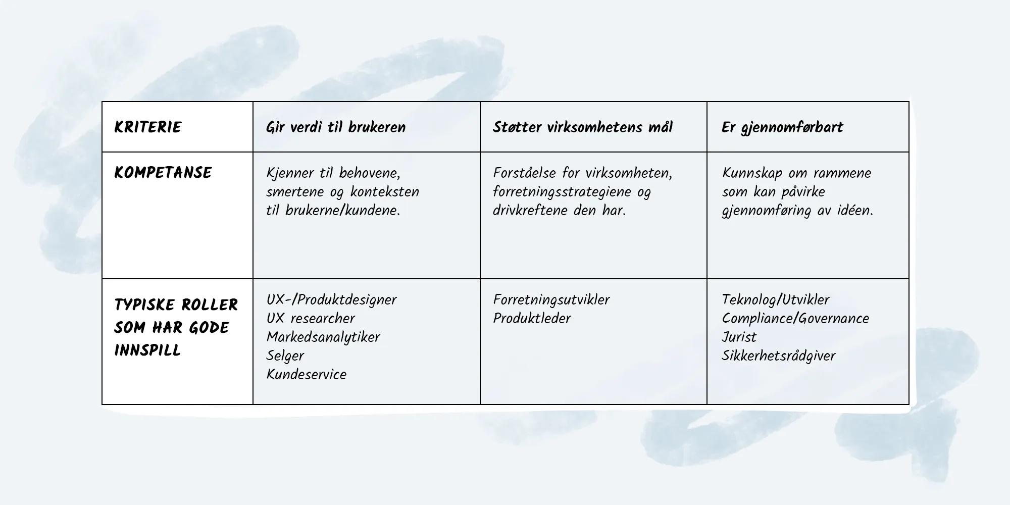 For å komme frem til levedyktige idéer, trenger vi de riktige folka med på laget. Mange konstellasjoner kan fungere, men fellesnevneren er at de alle er tverrfaglige. Teamet trenger kompetanse for å dekke de tre kriteriene jeg nevnte over: