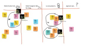 - Jeg liker å gruppere lappene underveis, sånn at det blir lettere å holde oversikt over temaer og å finne igjen enkeltlapper etterpå. Pass på å ikke lage for brede kategorier. Det bør være ting det går an å finne tiltak for!