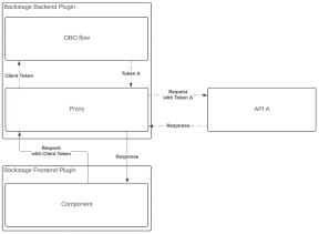 Vi ønsker å abstrahere bort OBO-flyten fra klienten. Dette kan gjøres ved å lage en backend-plugin, som vil fungere som en proxy. En fordel med dette er at man aldri ser Token A i nettverksloggen. I Backstage slipper man også CORS-problematikk dersom man utfører kall gjennom backend-pluginen.