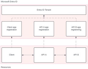 Figuren over illustrerer et slikt system, hvor Client, API A og API B har hver sin app-registrering i Entra ID. Klienten skal bruke API A til å hente data fra API B. API A autentiserer requests med Token A, og API B autentiserer requests med Token B. I tillegg til dette har Client også en token (heretter Token FE) som har blitt hentet etter innlogging.